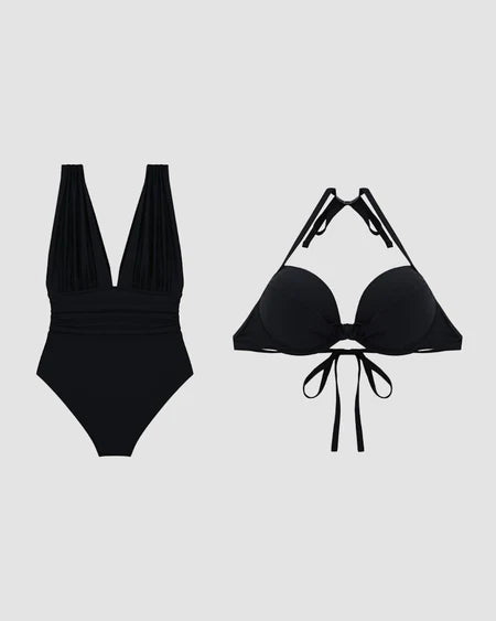 Deep Plunge Ruched Swimsuit with Halter Bra Two-Piece Set