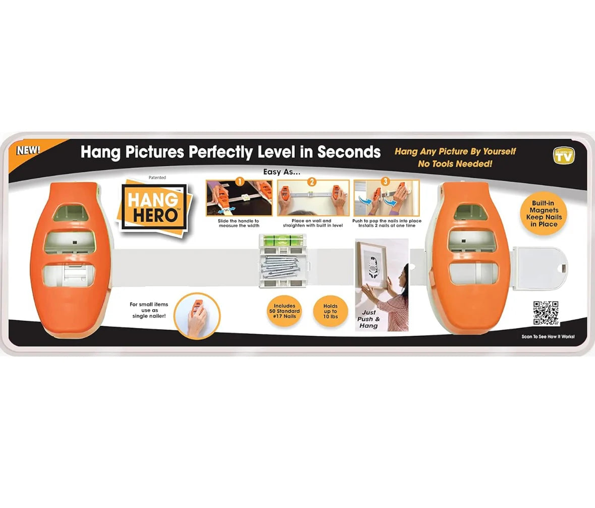 Just load the nails into the magnetic guide, slide to match your frame’s width, level it, and press—Hang Hero sets the nails at the ideal depth and angle every time. No hammer, no measuring, no hassle. Supports up to 10 lbs and works with frames of any shape or size.